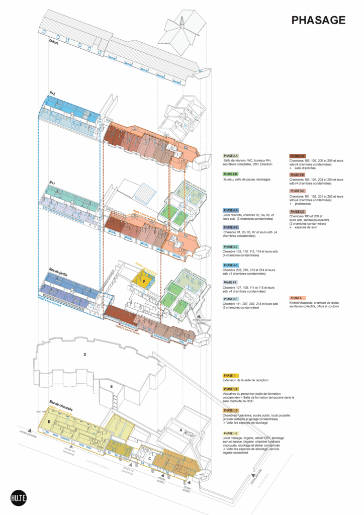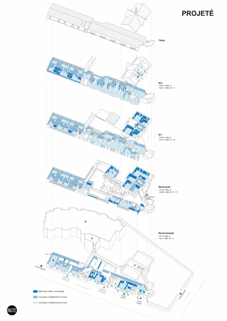 • Réaménagement par pôles : administratif, soins, communs, public, technique